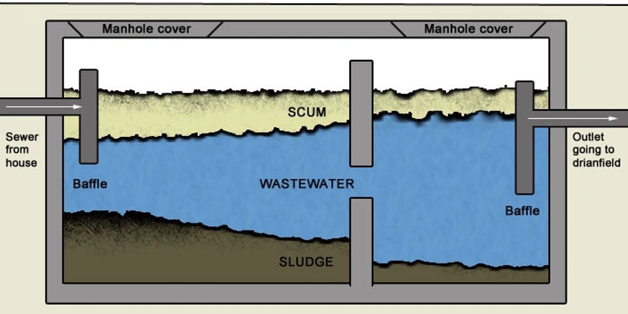 The septic tank is a small, on-site sewage treatment and disposal system buried in the ground. The modern septic tank is a water-tight box usually made of pre-cast concrete, concrete blocks, metal, or fiberglass. When household waste material enters this box, several things occur: